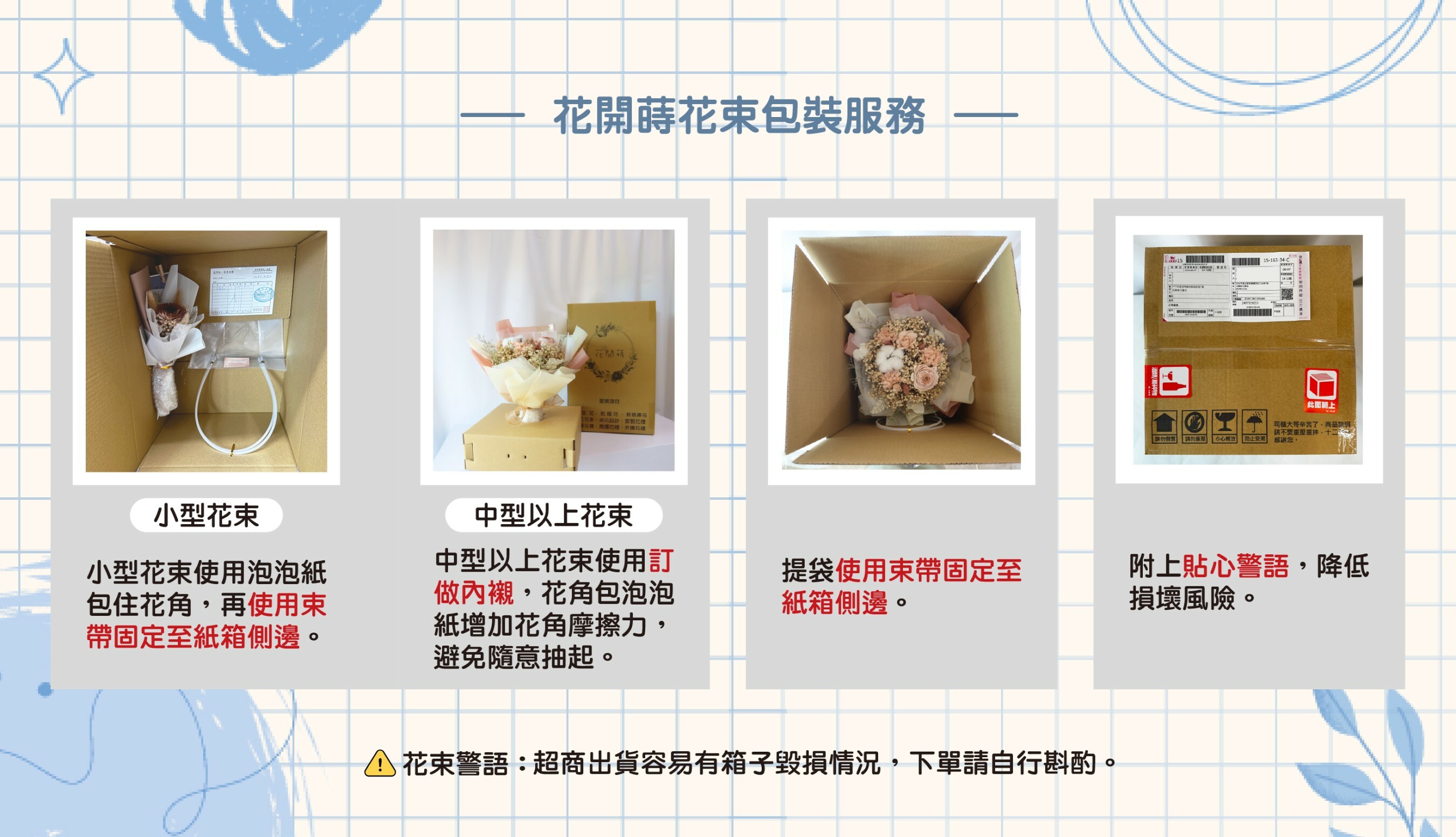2.部分花材為乾燥花材質,寄送過程難免會有些許掉落情況屬正常現象。
